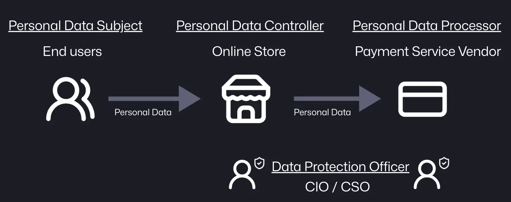 - Personal Data Processor. The entity (person, company, or organization) that processes personal data on behalf of the data controller. Data processors must adhere to the instructions of the data controller and comply with GDPR requirements related to data security and breach notification. e.g. Payment Service Vendor.